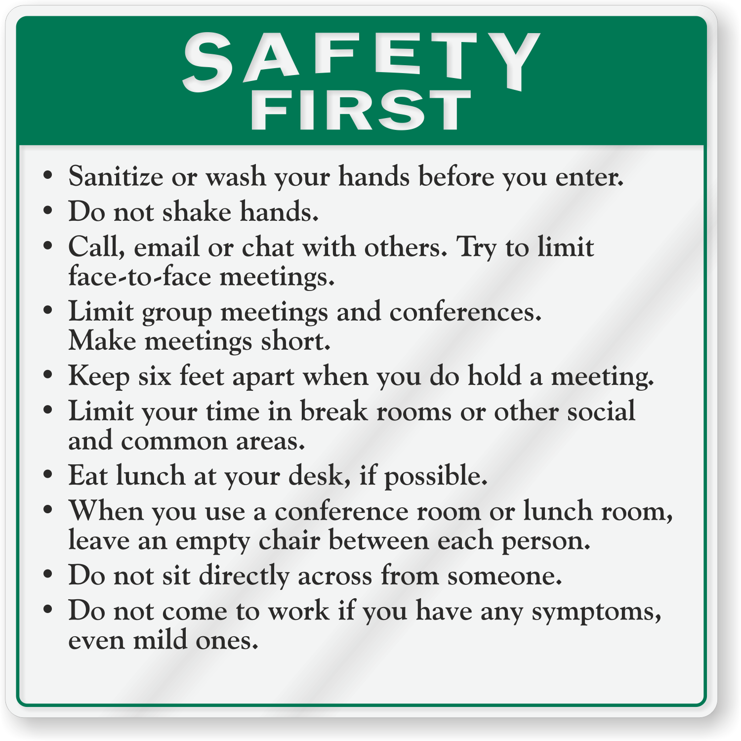 Custom Social Distancing ShowCaseâ„¢ Wall Sign: Safety First - Sanitize Or Wash Your Hands Before You Enter. Do Not Hand Shake. Keep Six Feet Apart.