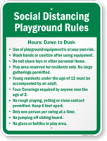 Keep playground users informed that sharing toys, jumping, bringing glass, rough playing, yelling, etc. are not allowed but washing hands, wearing face covering, and not gathering at a place is necessary.