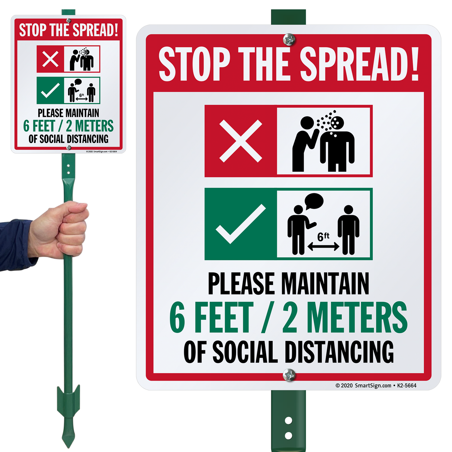 In order to protect everyone against infection, this Social Distancing LawnBoss Sign asks them to stand 6 feet apart.