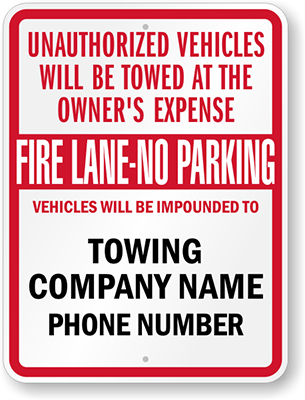 Custom Tow Away Sign: Unauthorized Vehicles Will Be Towed At The Owner's Expense, Fire Lane-No Parking, Vehicles Will Be Impounded To, Towing Company Name, Phone Number