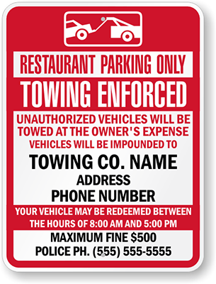 Custom Tow Away Sign: Restaurant Parking Only, Towing Enforced, Unauthorized Vehicles Will Be Towed At The Owner's Expense, Vehicles Will Be Impounded To, Towing Co. Name Address Phone Number, Your...