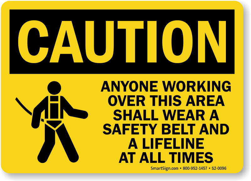 An OSHA Caution Sign effectively indicates the necessity to wear a safety belt and a lifeline over an unprotected area.