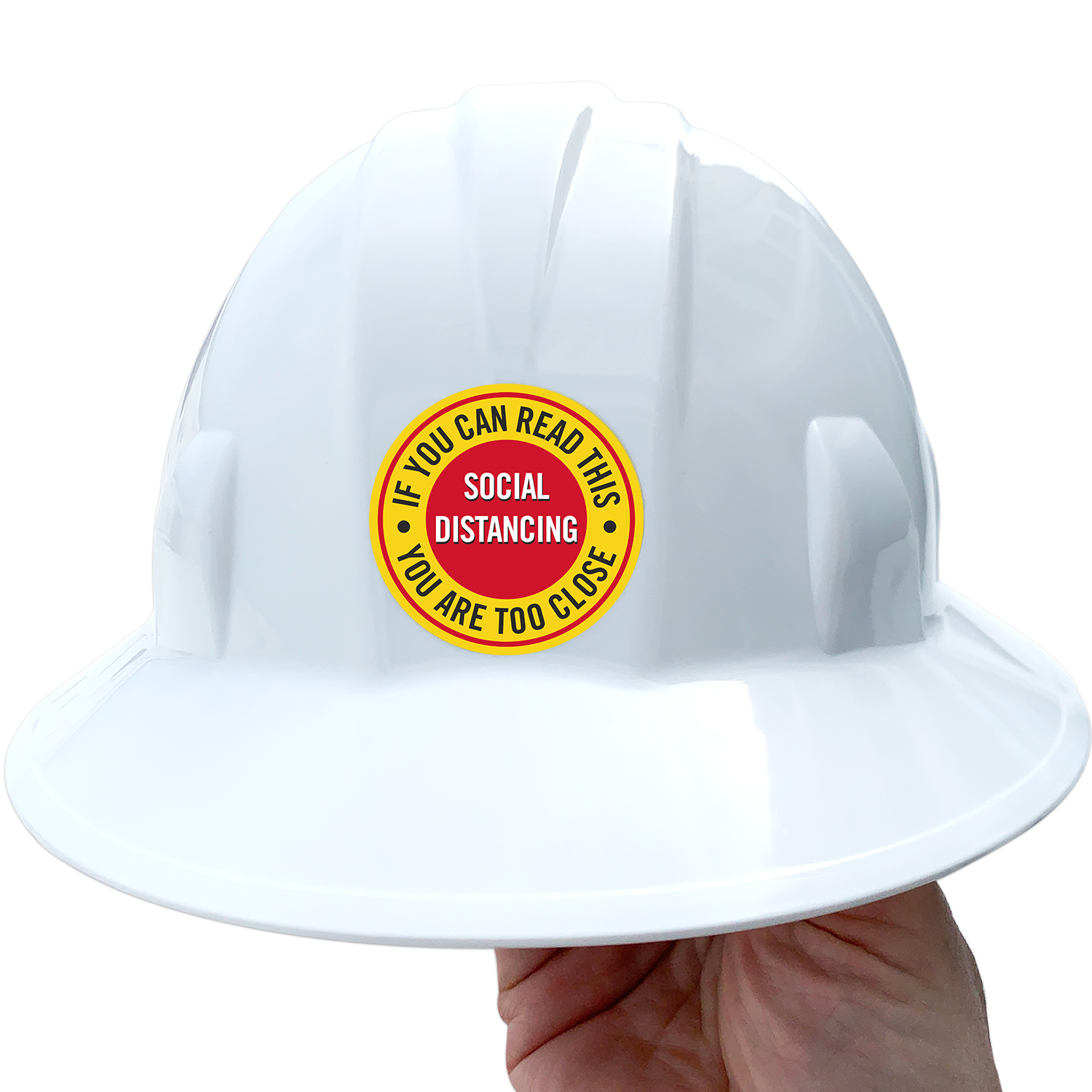 Make sure your crews are taken precautions to prevent the spread using hard hat stickers to remind them of social distancing protocol.