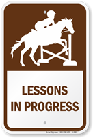 Indicate horse riding zone by installing this Horse Riding sign and warn people to watch out as riding lessons are in progress. Relevant graphic increases the visibility of your sign.