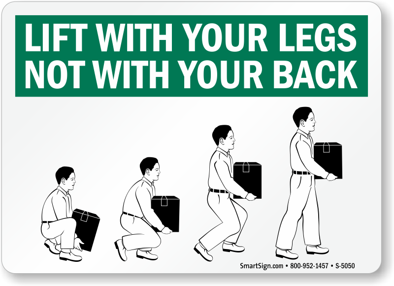 Remind workers to lift heavy objects using legs and not the back to prevent muscle injuries. This sign with sequential graphics instructs everyone about the correct way of lifting.