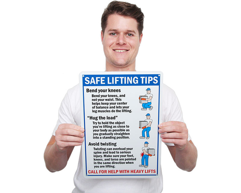 We carry lifting instruction signs that illustrate proper body mechanics for safe manual lifting - including bend your knees, keep the load close, and do not twist reminders. Signs are available in aluminum, plastic, and adhesive vinyl in multiple sizes for posting at loading docks, receiving areas, and any location where manual handling of heavy materials is a routine daily task.