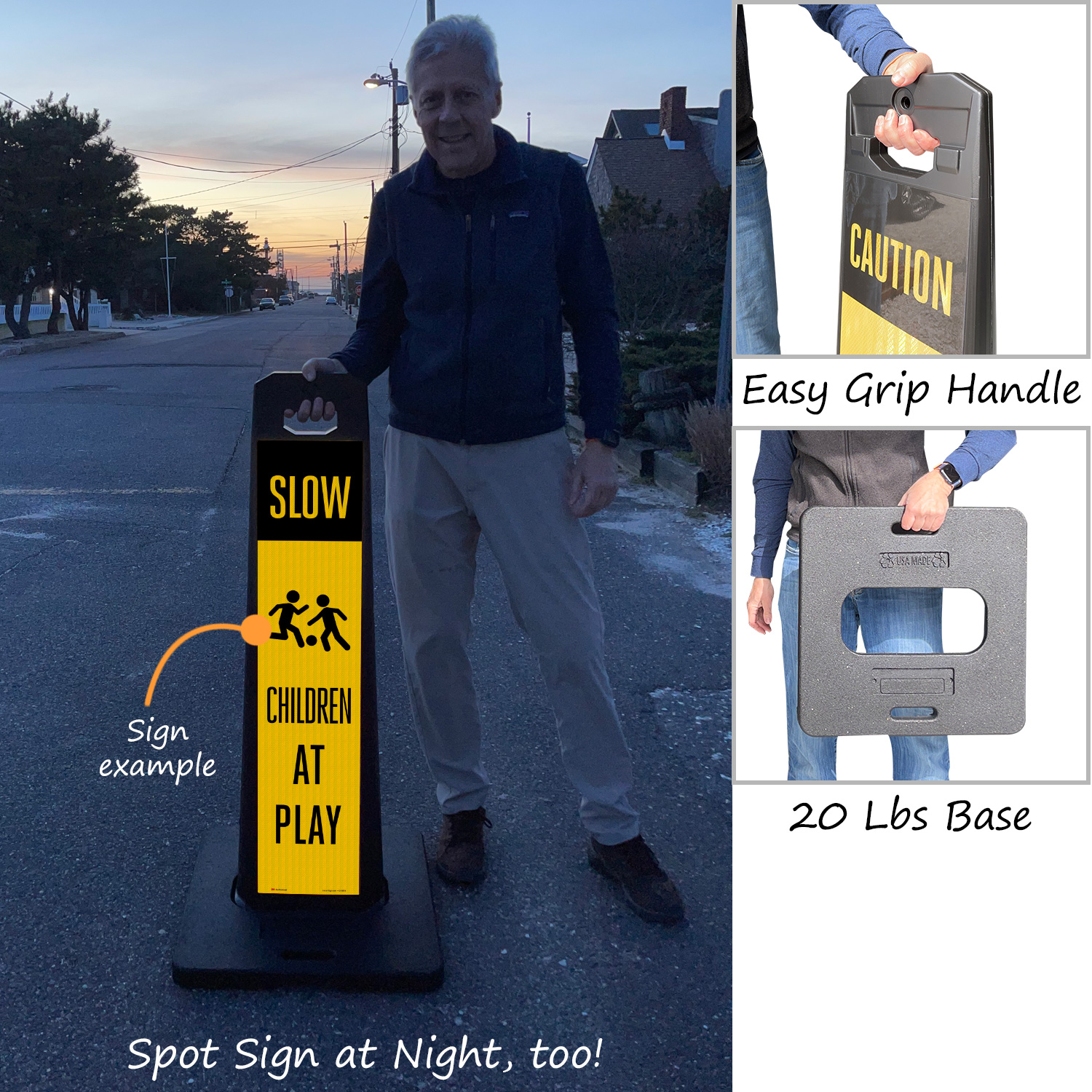 • Sign panel and base are stackable for compact storage.