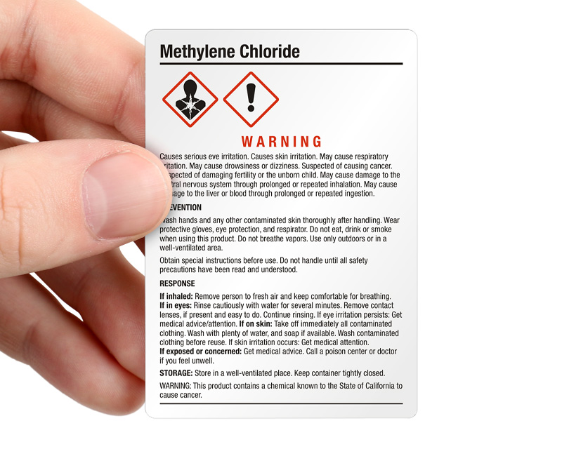 Ensure workplace safety with our high-quality Methylene Chloride Labels! The chemical, also known as, Dichloromethane, is used as a solvent in the production of plastics, pharmaceuticals, and other chemicals. Even construction companies use Methylene Chloride in paint-stripping products and adhesive removers. These and many such facilities require these labels in informing workers and individuals about potential hazards and safety precautions when dealing with Methylene Chloride-containing products or substances.