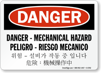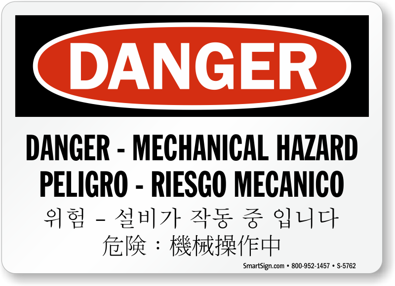 By posting this OSHA Danger Sign, make sure your multilingual workforce is notified of a mechanical hazard.