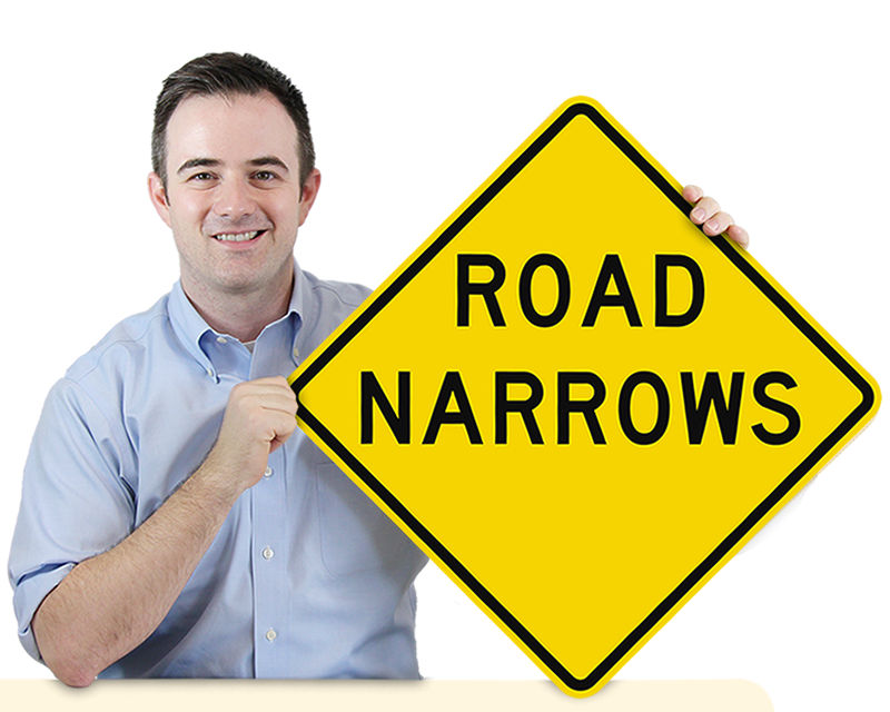 Narrow road signs are required when the roadway width reduces significantly, typically when lanes narrow to less than 9 feet wide or when the usable width becomes insufficient for two vehicles to pass safely. These signs must be placed 200-700 feet before the narrow section depending on road speed.