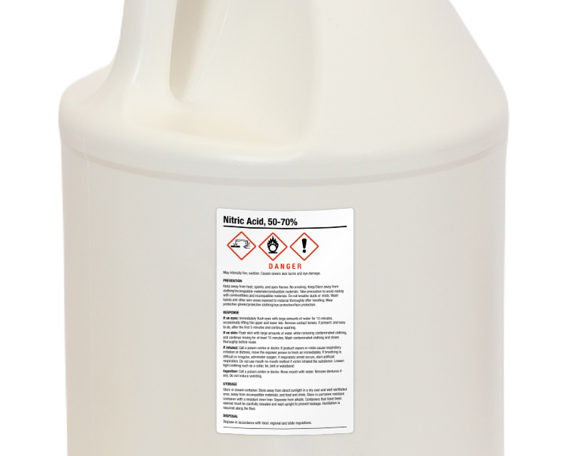 Keep everyone informed of the dangers, preventive care and immediate response to nitric acid with these effective Nitric Acid GHS labels. Specifically designed to provide all-encompassing information regarding the chemical properties and appropriate handling procedures. Ensure that employees and personnel have access to vital information regarding Nitric Acid in your facility, necessary for their safety and well-being.