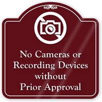 Draw attention to your message with this attractive designer sign. Prohibit use of cameras and video recording devices.