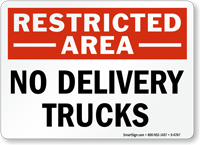 Use this Restricted Area Sign to prevent delivery trucks from entering the zone. Red header and bold legend immediately catches attention.
