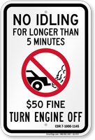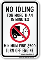 Fines for violating no idling restrictions typically range from $50–$500 depending on jurisdiction and vehicle type. Commercial vehicles often face higher fines. Signs such as the no idle zone turn your engine off sign are used to emphasize enforcement near schools and public areas. For legal standards, see MUTCD Section 2B.