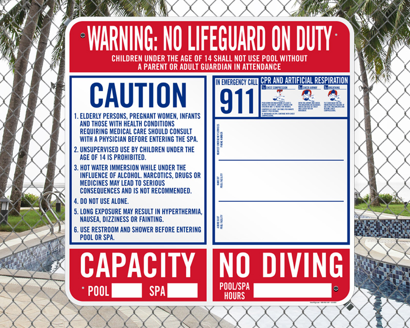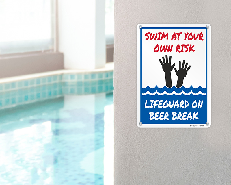 Explore our extensive collection of No Lifeguard On Duty Signs! Ensure the safety of your pool area by effectively communicating the absence of a lifeguard on duty and swimmers must swim at their own risk.