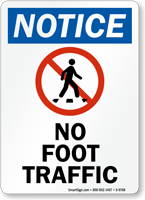 A no pedestrian traffic sign prohibits foot traffic in areas where walking creates safety hazards such as highways, bridges without sidewalks, tunnels, or high-speed roadways. These signs feature a walking person symbol inside a red circle with a diagonal line. Examples include the warning no pedestrian crossing sign and the pedestrian traffic sign. For design standards, refer to MUTCD Section 2B.