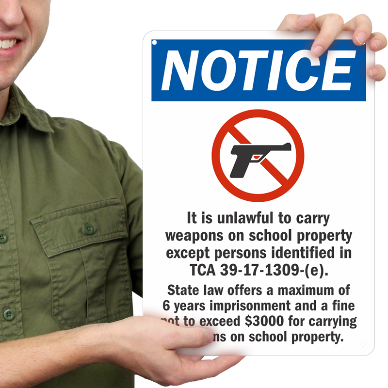 Notice No Weapons in Schools Sign: It Is Unlawful to carry Weapons On School Property Except Persons Identified In TCA 39-17-1309-€ (S-8062)