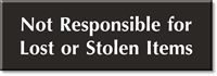 Use a Not Responsible For Lost Or Stolen Items Engraved Sign to do away with liabilities. A posted notice like this reminds visitors and patrons to take extra care of their belongings.