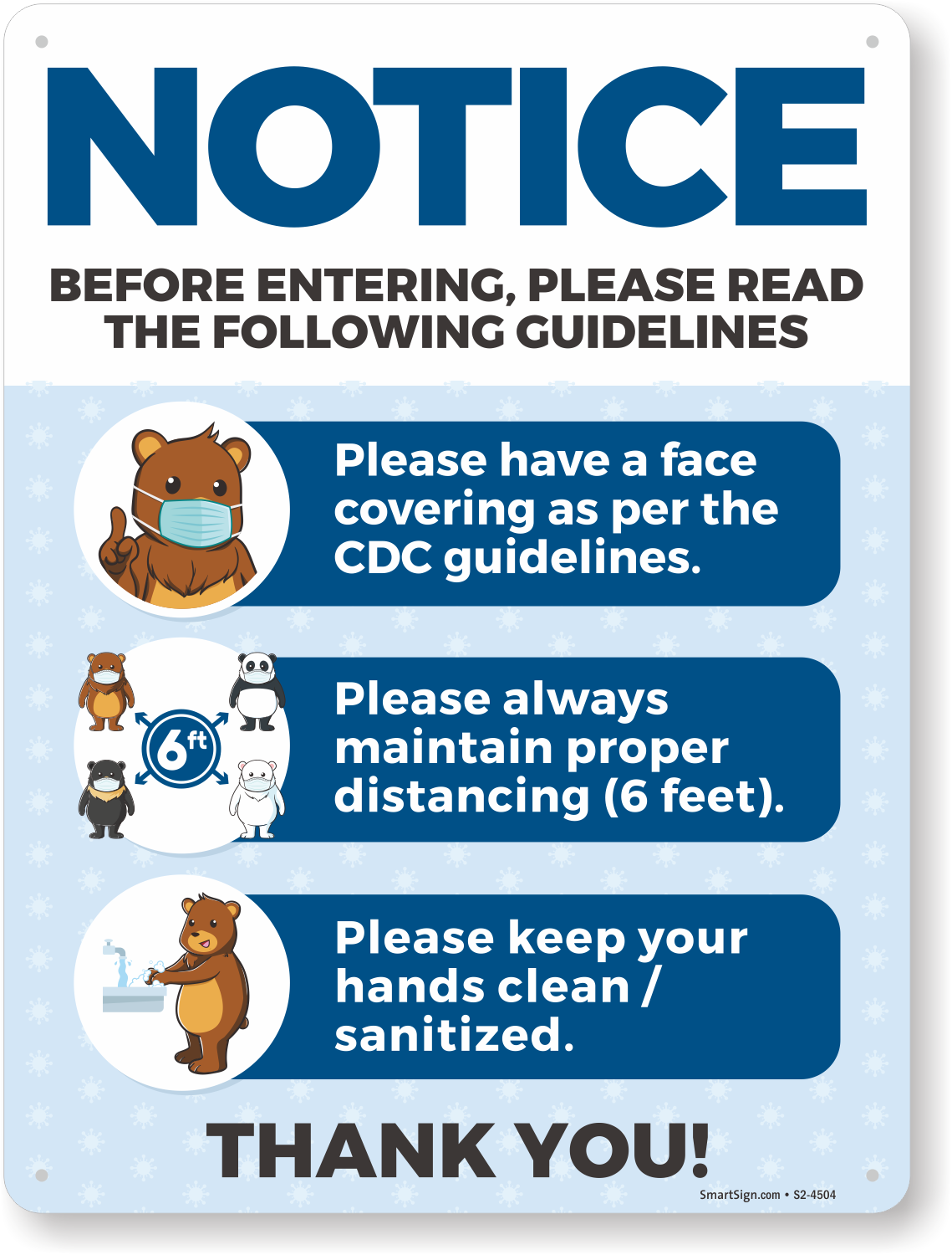 Social Distancing Guideline Sign: Notice Read Guidelines Before Entering Have a Face Covering, Maintain 6 Feet, and Keep Hands Clean