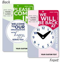 Size: 15" x 10" Material type: Laminated Plastic Be Back Clock Sign