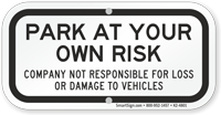 A simple sign can save you and your drivers many thousands of dollars. Alert drivers to parking risks in unsafe or unsecured areas. Use park at your own risk signs to prevent accidents, explain damages, and reduce your liability. Use for hotel, church or store parking lots. Protect against theft, careless drivers, snow… even foul balls.