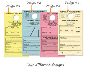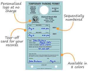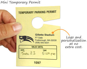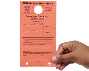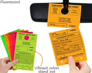 Our colorful temporary paper parking permits are printed with your name and address. You may even use your logo. Find two sizes: