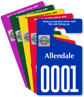 While most prefer this medium size, some customers look for jumbo 7-inches x 3.5-inch permits for better visibility or the smaller 3-inches x 2.75-inch permits which do not obstruct the driver’s view. We also offer horizontal 2-inches x 4.75-inches hang tags which are convenient and compact and won't need to be adjusted or moved for a better view.