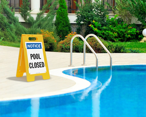 “Pool Closed” standing floor signs bring together ready portability and high conspicuity. The two-sided signs are offered as a kit containing an injection-molded polypropylene frame and a couple of plastic message panels. With an easy-grip handle on the frame, the sign can be easily moved around, and it can even be folded flat for convenient storage. Additionally, the message panels are swappable and can be locked into place with the pins provided.