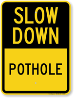 Warn road users of pothole ahead so that they can carefully drive or walk past it. Install this Slow Down sign and prevent road accidents.
