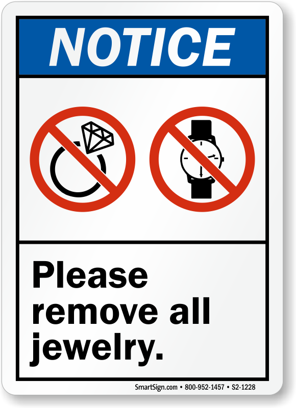 Encourage safety and security at workplace. Use this ANSI Notice Sign to inform your workers to remove all jewelry before entering the area.