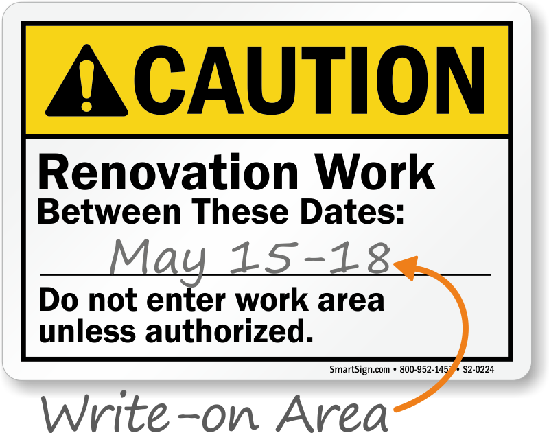 Write the dates during which renovation work will take place in your building. This ANSI Caution Sign has a writeable surface that accepts writings from pen and permanent marker.