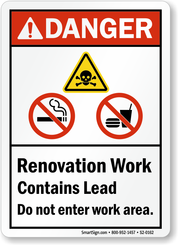 Renovation Work Contains Lead' sign features universally recognized symbols of No Smoking, No Eating or Drinking and Danger. ANSI-format sign is great for prohibiting entry.