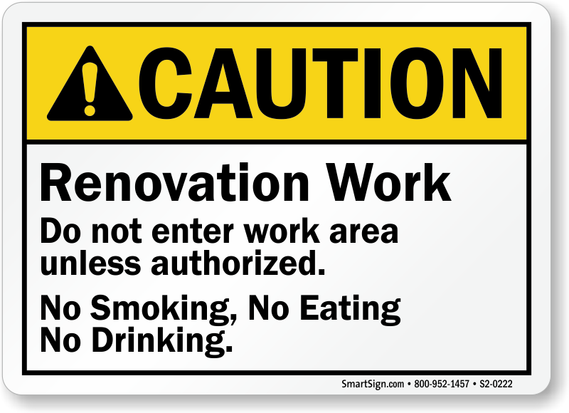 Indicate potentially hazardous areas with ANSI Caution Sign. Sign prohibits unauthorized entry, smoking, eating, or drinking in renovation area.