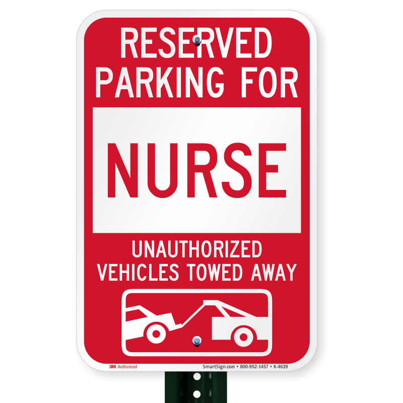 Cars parking in your spot are the worst. This spot is strictly for the nurse. This red and white sign with a tow away graphic stands out to drivers and warns unauthorized vehicles of their risk of being towed.