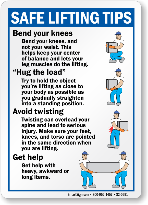 Lifting Instruction Sign: Safe Lifting Tips - Bend Your Knees, Hug The Load, Avoid Twisting, Get Help