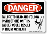 Use a "failure to read and follow instructions on this ladder could result in injury or death (with graphic)" sign.