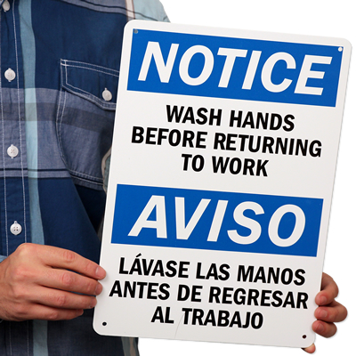 Washing hands regularly is one of the most important ways to reduce contamination. The bilingual language on this sign will help to communicate with a large audience.