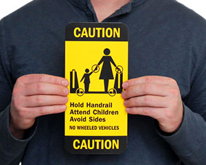 Hold the handrail! Help prevent accidents. ANSI compliant labels are hard to miss. Remind your customers or riders of the proper procedures when operating an escalator, and keep them safe!