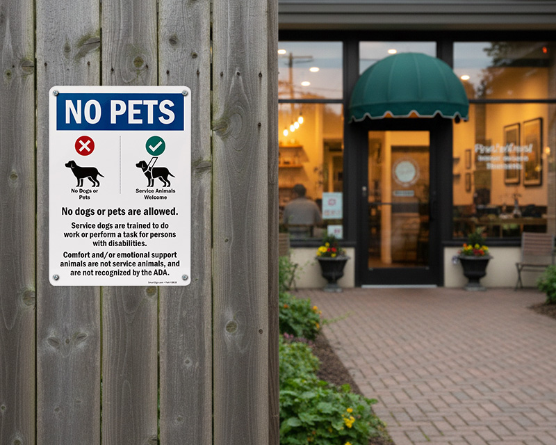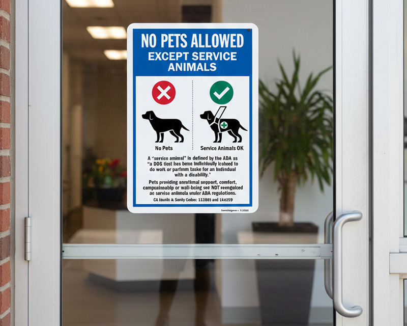 Clearly communicate your No Pets policy while welcoming trained service animals that assist people with disabilities and special needs.