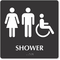 A shower sign with ADA compliant Braille and TactileTouchâ„¢ characters and pictogram makes sure your facility is compliant with building codes.