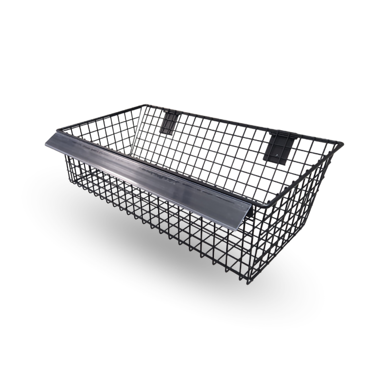 The Wire Slanted Basket is designed to fit on the Merchandising Panel for added merchandise capacity.