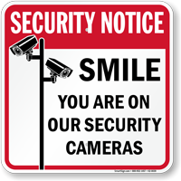 Smile You’re On Camera Signs can be installed anywhere you have surveillance cameras installed, provided they are conspicuous (within normal eye range) and in areas with adequate lighting. While aluminum signs are ideal for outdoors, plastic, vinyl, or polyester signs or labels are ideal for indoor applications. Some of the best locations for these camera signs are -