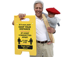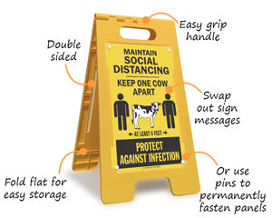 Stand-up Floor Signs to reinforce social distancing practices are your best investment. Free-standing, folding, lightweight and completely portable signs are printed on both sides for optimum effect, coming and going. The message on both sides is the same, unless noted.