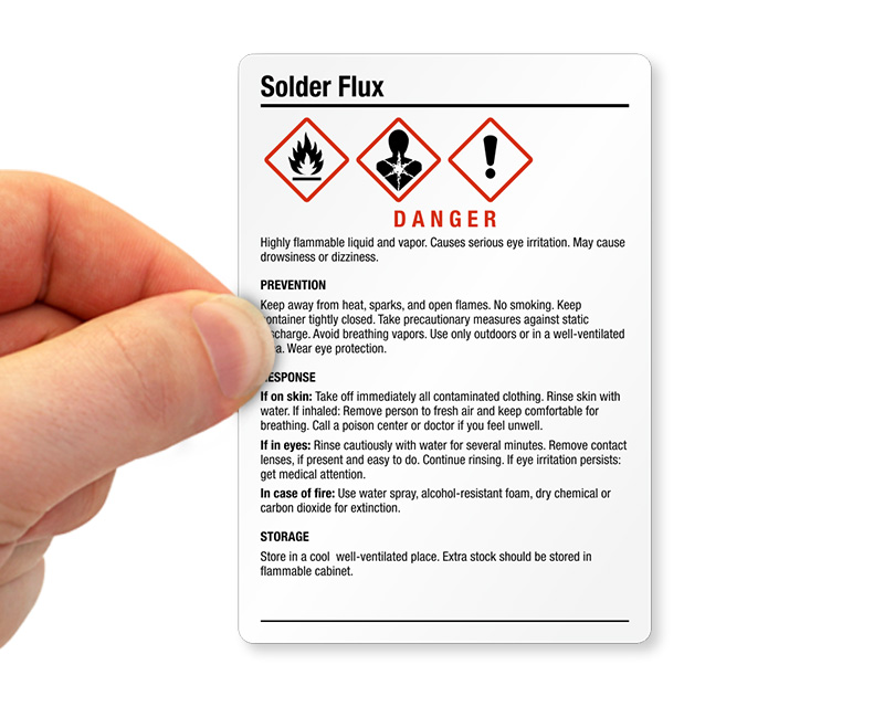 Improper handling of Solder Flux can cause drowsiness and serious irritation in the eyes. Prevent your workers from hazards associated with Solder Flux by informing them about the chemical with this GHS Label.