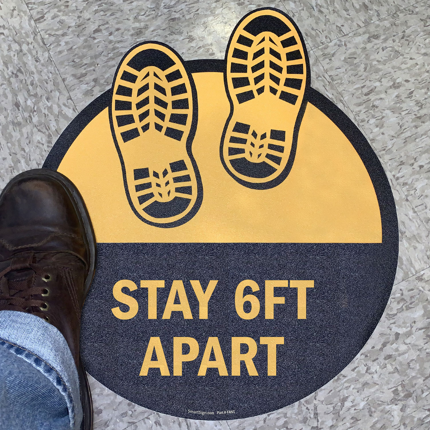 Remind people to stay 6-feet apart with this conspicuous floor sign. Use several of these signs to mark exactly how far apart 6 feet is.
