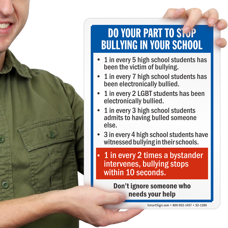 You might save a life by stopping someone from being bullied. Use this sign to remind people to prohibit bullying.