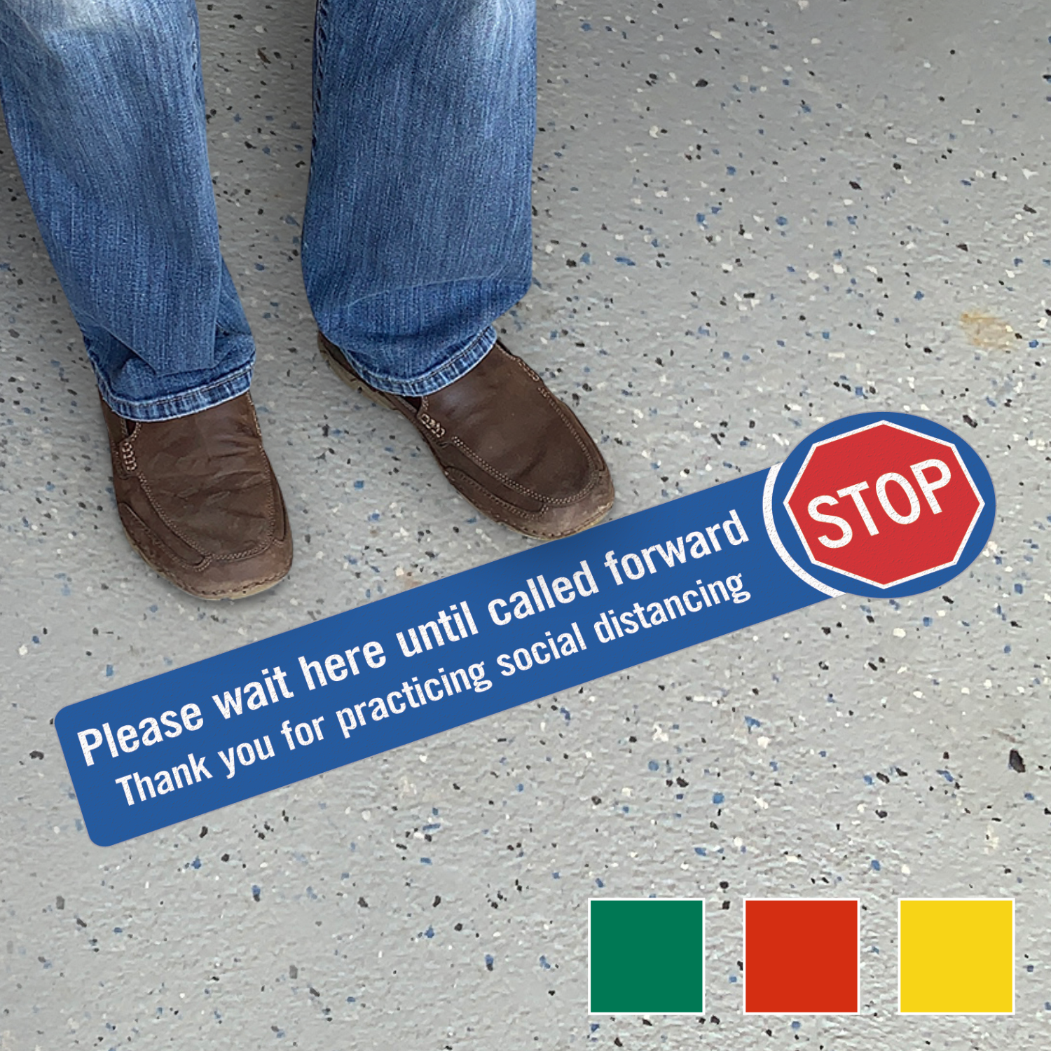 SlipSafe⢠Floor Sign: Stop - Please Wait Here Until Called Forward, Thank You For Practicing Social Distancing