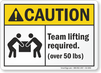 Keep your workforce informed, motivated, and safe. Use this ANSI Caution Sign to convey that a team is required for lifting objects over 50 Lbs.