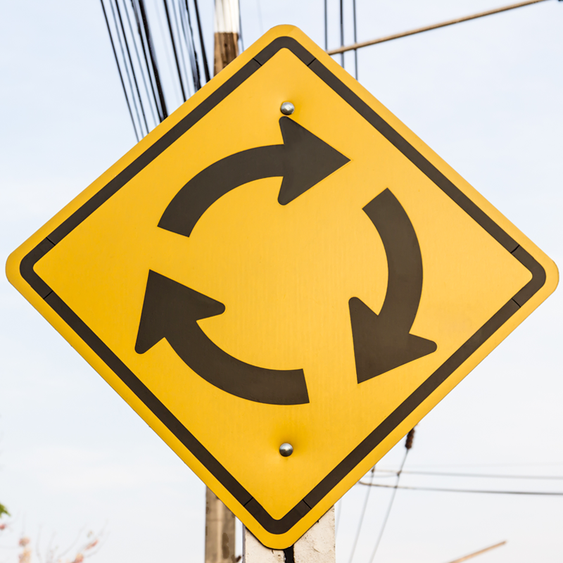 Arrowed sign alerts drivers to the clockwise circular flow of the intersection. Signs make complicated road layouts less confusing.