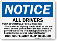 Truck Drivers Signs are perfect for any truck or truck stop area. Driver's Instruction Signs help direct drivers to designated areas and remind them to chock wheels or set brakes. Signs and Labels are an inexpensive and efficient way to help prevent accidents.